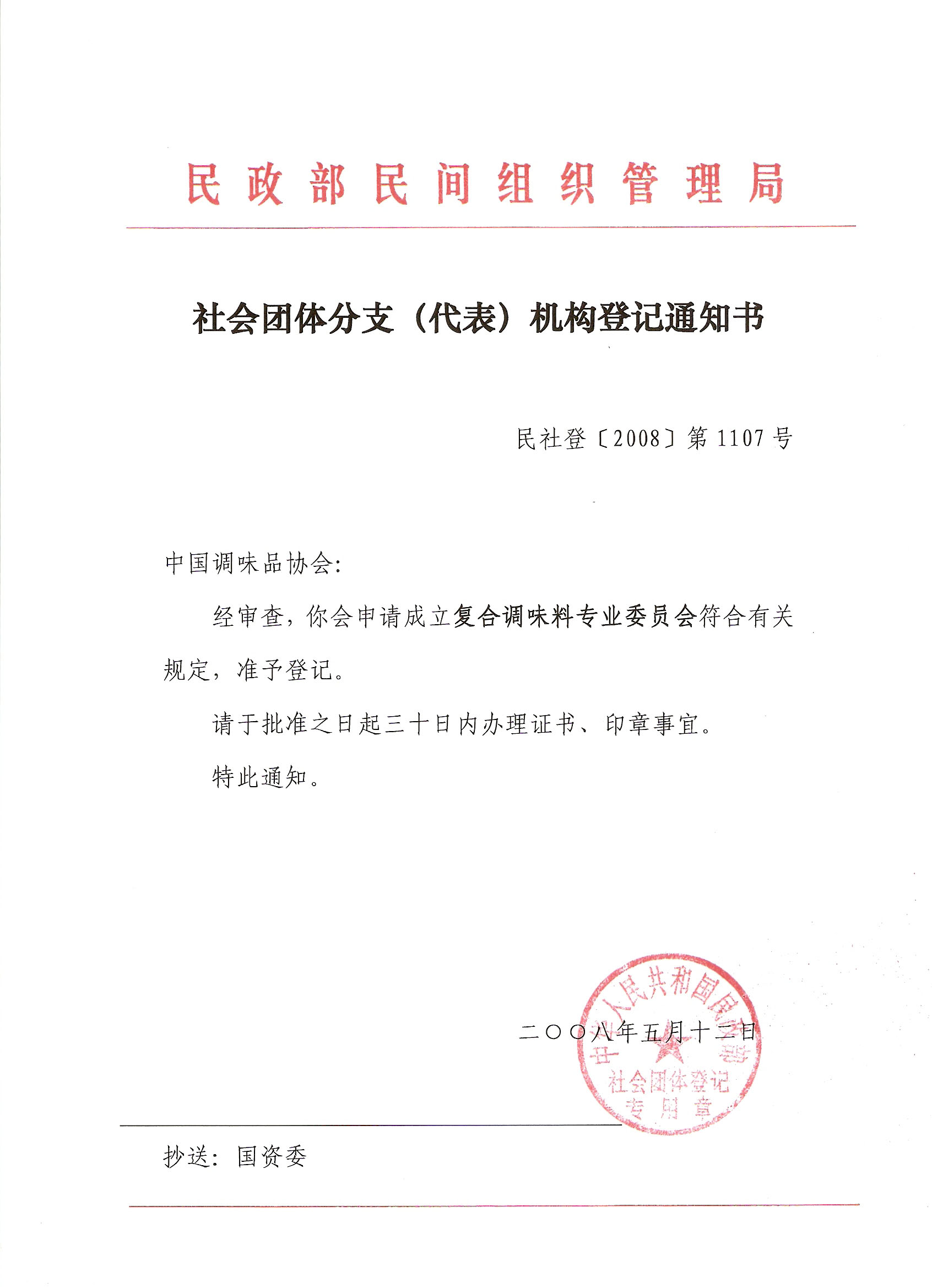 经中华人民共和国民政部(民社登[2008]第1107号文件)(见附件一)批准,51影视(以下简称协会)复合调味料专业委员会正式成立。